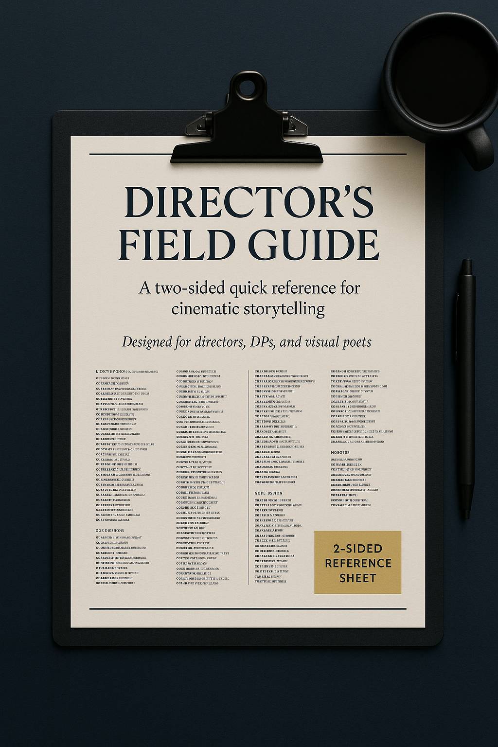 The Director’s Field Guide is your 1 page no-fluff, field-tested toolkit for leading a film set with clarity, confidence, and creative integrity. Whether you're directing your first short or prepping a feature, this guide helps you stay focused on what matters: your vision, your team, and your story. Designed by a working filmmaker with a decade of industry experience, it blends practical steps with people-first leadership — perfect for directors who value purpose over perfection. No matter your genre, budget, or tools — from analog to AI — this resource brings timeless value to every kind of filmmaker. Download it now and start directing with intention.